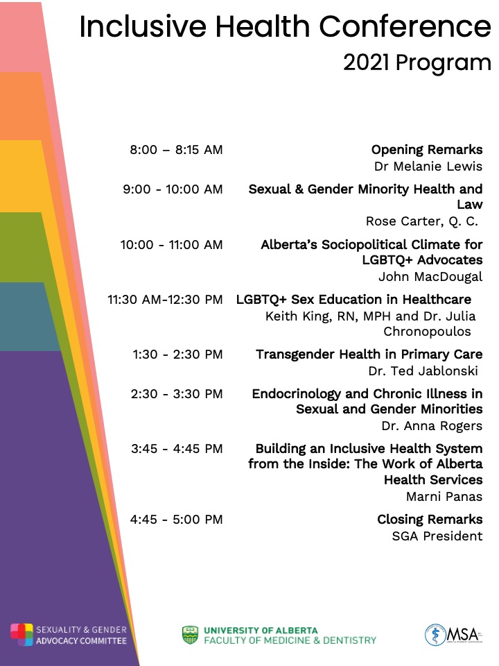 We deeply appreciate your support, understanding, and interest in learning about LGBTQ+ health. This was the 7th year of the conference and had a record attendance of over 150 healthcare workers, students, and community members – with registrations climbing daily. We think this speaks to a growing dedication to improving LGBTQ+ health in Alberta and beyond.